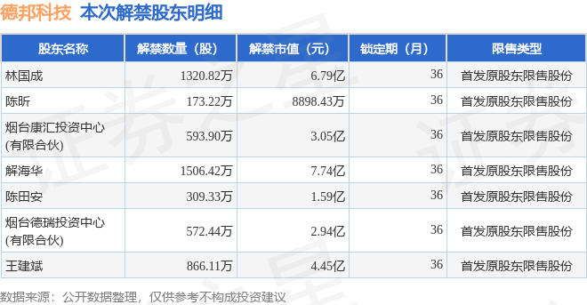 证券之星消息,根据市场公开信息整理,德邦科技(688035)于9月19日将有5342.24万股限售股份解禁,为公司首发原股东限售股份,占公司总股本37.56%。(本次数据根据历史公告整理得出,实际情况以上市公司最新公告为准)最近一年内,该股累计解禁130.1万股,占总股本的0.91%。本次解禁后,公司已无限售股份。具体如下图所示: