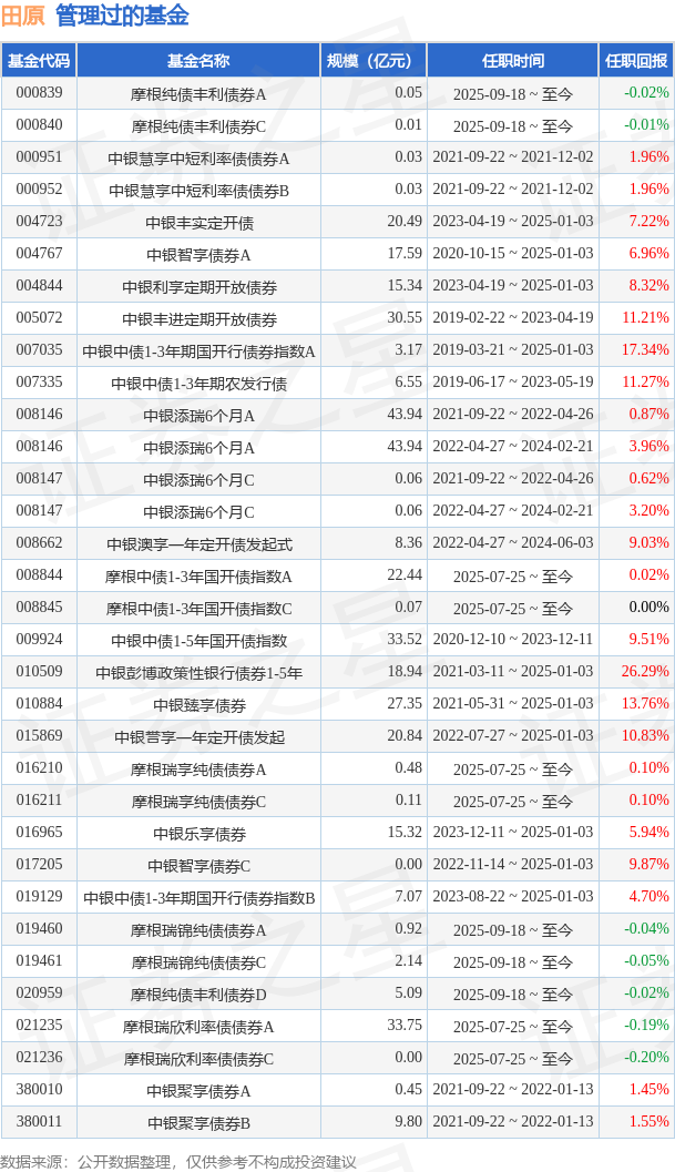 田原(TianYuan)先生:中国国籍,工学硕士。2012年加入中银基金管理有限公司,曾任固定收益研究员、中银资产管理有限公司资管一部投资经理。曾任中银丰进定期开放债券型发起式证券投资基金基金经理,2019年3月至2025年1月任中银中债1-3年期国开行债券指数证券投资基金基金经理,曾任中银中债1-3年期农发行债券指数证券投资基金基金经理,2020年10月至2025年1月任中银智享基金基金经理,2020年12月10日至2023年12月11日任中银中债1-5年期国开行债券指数基金基金经理。2022年4月至2024年2月担任中银添瑞6个月定期开放债券型证券投资基金基金经理。2022年4月27日至2024年6月3日担任中银澳享一年定期开放债券型发起式证券投资基金基金经理。2023年4月19日担任中银利享定期开放债券型证券投资基金基金经理。2023年12月11日至2025年1月3日担任中银乐享债券型证券投资基金基金经理。曾任中银臻享债券型证券投资基金、中银丰实定期开放债券型发起式证券投资基金、中银彭博政策性银行债券1-5年指数证券投资基金、中银誉享一年定期开放债券型发起式证券投资基金基金经理。2025年7月25日起任摩根瑞享纯债债券型证券投资基金、摩根中债1-3年国开行债券指数证券投资基金、摩根瑞欣利率债债券型证券投资基金基金经理。