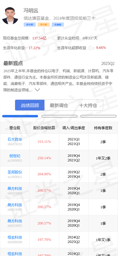 恒玄科技(688608)是基金大佬冯明远的重仓股。,其在整个职业生涯内年化收益高达17.22%。冯明远的大佬持仓 - 战绩回顾截图如下: