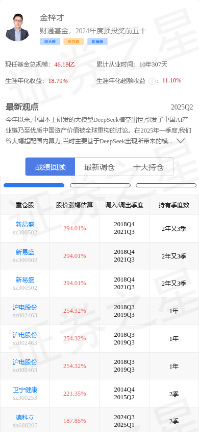 仕佳光子(688313)是基金经理金梓才的重仓股。,其在整个职业生涯内年化收益高达18.79%。金梓才的大佬持仓 - 战绩回顾截图如下: