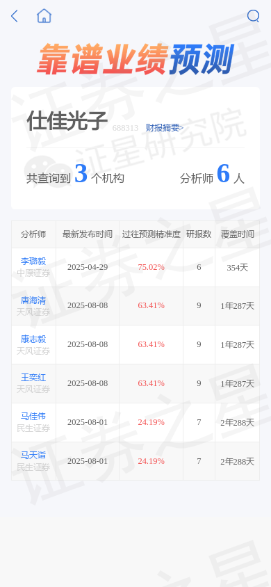 如果您对这家公司感兴趣,可以参考证星研究院统计的仕佳光子的分析师业绩预测数据,其中根据中原证券的分析师李璐毅预测公司未来PE为19.0(更多特色估值数据尽在证星研究院,所有数据均来源公开资料,期且所有资料都存在一定时间滞后,所有相关数据均不可作为投资决策单一依据)。