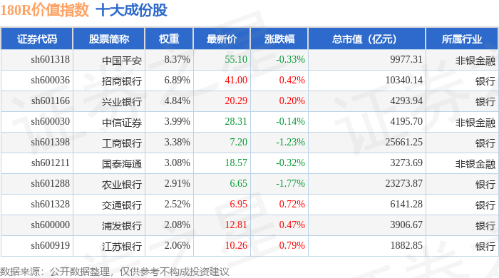 证券之星消息,9月19日,180R价值(000031)指数报收于3113.33点,涨0.03%,成交1877.11亿元,换手率0.46%。当日该指数成份股中,上涨的有61家,潞安环能以5.63%的涨幅领涨,下跌的有60家,寒武纪以5.05%的跌幅领跌。