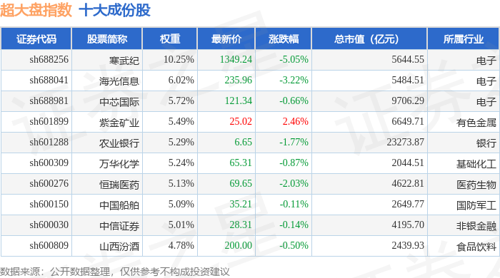 证券之星消息,9月19日,超大盘(000043)指数报收于2534.48点,跌0.93%,成交952.74亿元,换手率0.25%。当日该指数成份股中,上涨的有7家,紫金矿业以2.46%的涨幅领涨,下跌的有13家,寒武纪以5.05%的跌幅领跌。