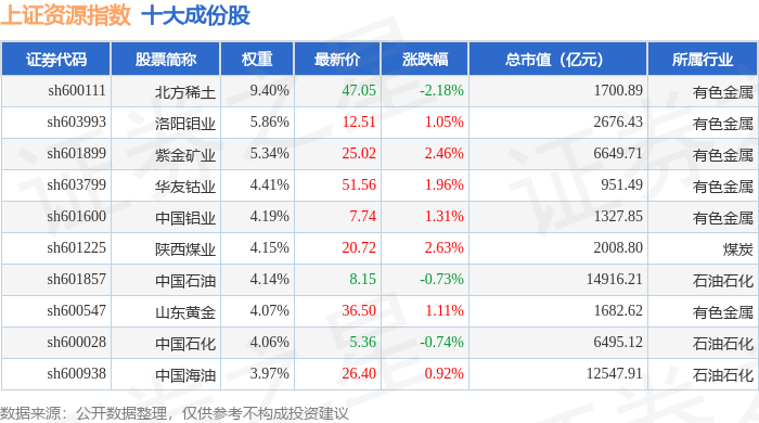 证券之星消息,9月19日,上证资源(000068)指数报收于3385.38点,涨1.04%,成交513.48亿元,换手率0.65%。当日该指数成份股中,上涨的有38家,华阳股份以7.8%的涨幅领涨,下跌的有9家,北方稀土以2.18%的跌幅领跌。