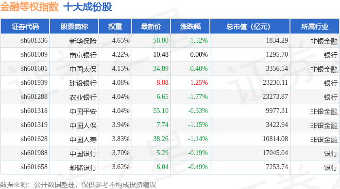 证券之星消息,9月19日,金融等权(000076)指数报收于5383.45点,跌0.3%,成交443.47亿元,换手率0.32%。当日该指数成份股中,上涨的有9家,杭州银行以1.72%的涨幅领涨,下跌的有18家,中信建投以2.06%的跌幅领跌。