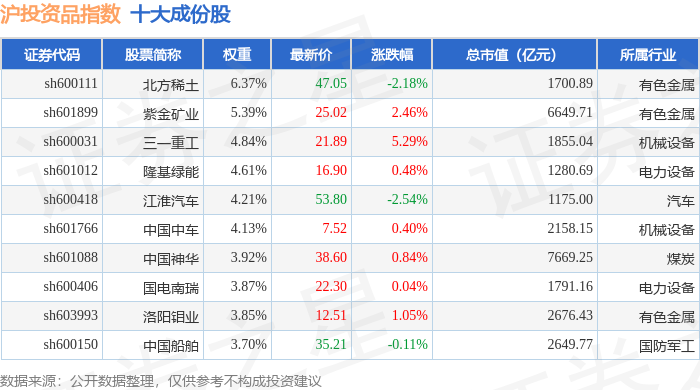 沪投资品(000102)指数十大成份股详情如下: