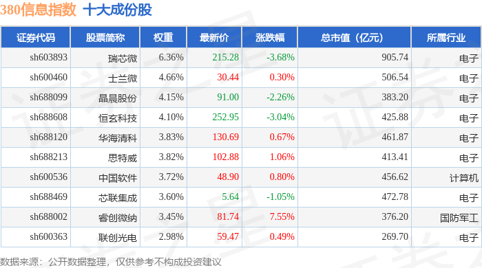 证券之星消息,9月19日,380信息(000111)指数报收于9677.61点,跌0.5%,成交400.37亿元,换手率2.68%。当日该指数成份股中,上涨的有19家,睿创微纳以7.55%的涨幅领涨,下跌的有27家,瑞芯微以3.68%的跌幅领跌。