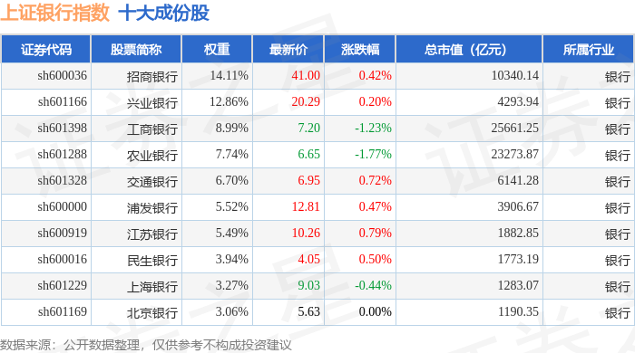 证券之星消息,9月19日,上证银行(000134)指数报收于1001.22点,涨0.04%,成交301.24亿元,换手率0.33%。当日该指数成份股中,上涨的有14家,齐鲁银行以2.9%的涨幅领涨,下跌的有8家,农业银行以1.77%的跌幅领跌。