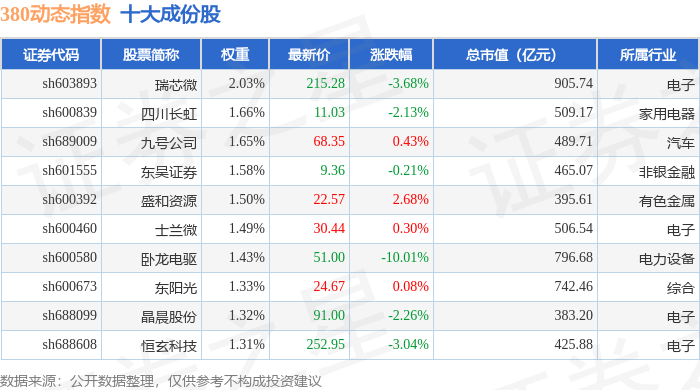 证券之星消息,9月19日,380动态(000141)指数报收于3908.05点,跌0.4%,成交1465.24亿元,换手率2.68%。当日该指数成份股中,上涨的有101家,长飞光纤以10.0%的涨幅领涨,下跌的有87家,上海建工以10.05%的跌幅领跌。