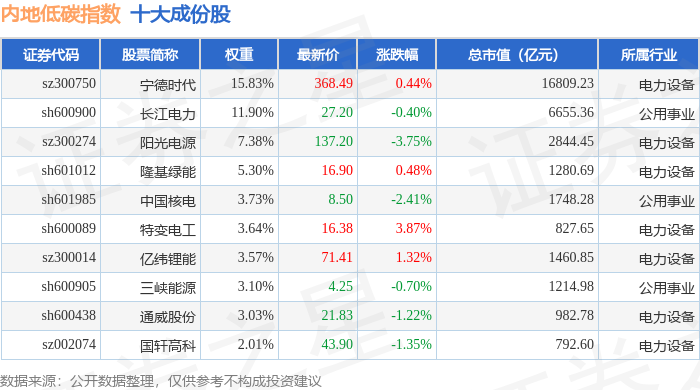 证券之星消息,9月19日,内地低碳(000977)指数报收于1957.44点,跌0.35%,成交939.34亿元,换手率1.18%。当日该指数成份股中,上涨的有22家,三一重能以6.52%的涨幅领涨,下跌的有25家,科达利以3.8%的跌幅领跌。