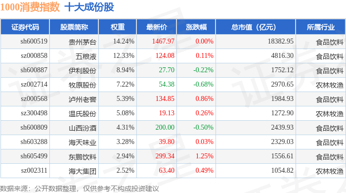 1000消费(399385)指数十大成份股详情如下: