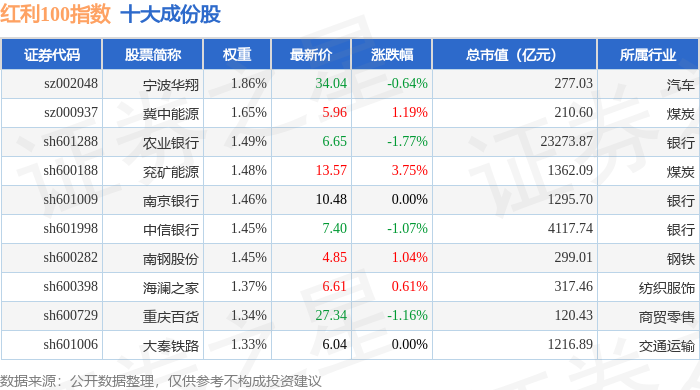 证券之星消息,9月19日,红利100(399411)指数报收于3438.06点,涨0.79%,成交531.22亿元,换手率0.46%。当日该指数成份股中,上涨的有62家,美盈森以10.07%的涨幅领涨,下跌的有32家,浙江美大以3.55%的跌幅领跌。