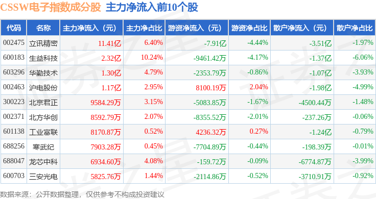 资金流向方面,CSSW电子(399811)指数成份股当日主力资金净流出合计52.47亿元,游资资金净流入合计22.02亿元,散户资金净流入合计30.45亿元。成份股资金流向详情见下表: