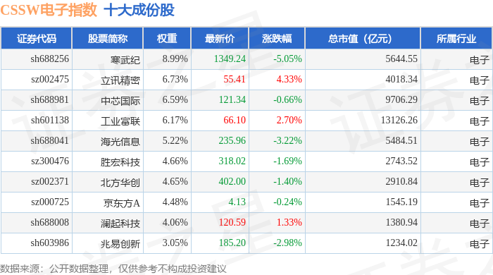 证券之星消息,9月19日,CSSW电子(399811)指数报收于5603.51点,跌0.71%,成交2077.43亿元,换手率2.68%。当日该指数成份股中,上涨的有22家,鹏鼎控股以4.97%的涨幅领涨,下跌的有38家,寒武纪以5.05%的跌幅领跌。