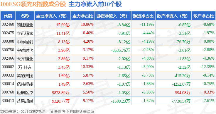 资金流向方面,100ESG领先R(470030)指数成份股当日主力资金净流出合计9.68亿元,游资资金净流出合计15.5亿元,散户资金净流入合计25.18亿元。成份股资金流向详情见下表: