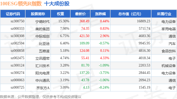 证券之星消息,9月19日,100ESG领先R(470030)指数报收于8972.43点,涨0.17%,成交1710.98亿元,换手率1.7%。当日该指数成份股中,上涨的有22家,赣锋锂业以10.0%的涨幅领涨,下跌的有28家,三花智控以8.56%的跌幅领跌。