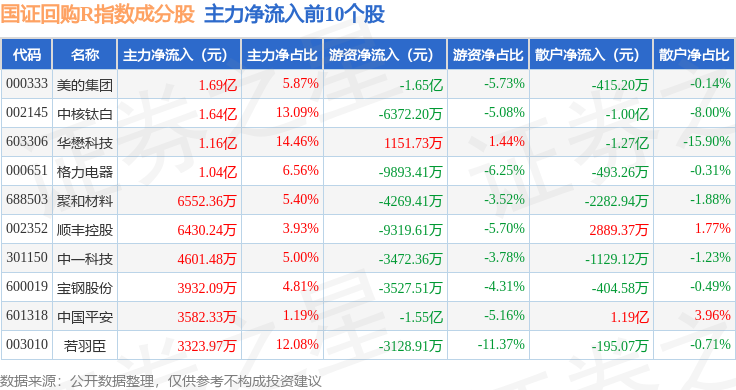 资金流向方面,国证回购R(480063)指数成份股当日主力资金净流入合计5.01亿元,游资资金净流出合计4.83亿元,散户资金净流出合计1829.47万元。成份股资金流向详情见下表: