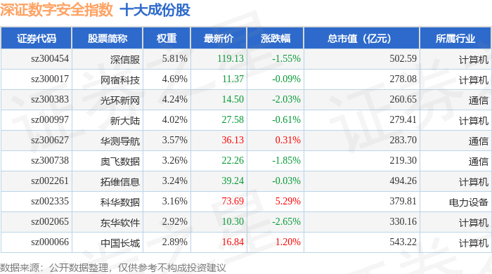 证券之星消息,9月19日,深证数字安全(970052)指数报收于3761.51点,跌1.13%,成交433.33亿元,换手率5.4%。当日该指数成份股中,上涨的有12家,科华数据以5.29%的涨幅领涨,下跌的有37家,汉威科技以9.87%的跌幅领跌。