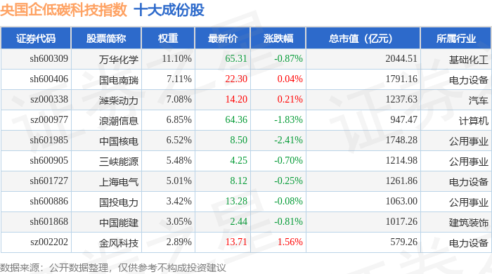 央国企低碳科技(980082)指数十大成份股详情如下: