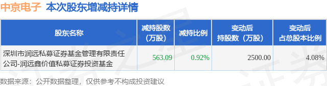 证券之星消息,9月19日中京电子发布公告《中京电子:关于公司股东减持计划实施完毕的公告》,其股东深圳市润远私募证券基金管理有限责任公司-润远鑫价值私募证券投资基金于2025年7月2日至2025年9月18日间合计减持563.09万股,占公司目前总股本的0.9192%,变动期间该股股价下跌2.63%,截止9月18日收盘报13.32元。