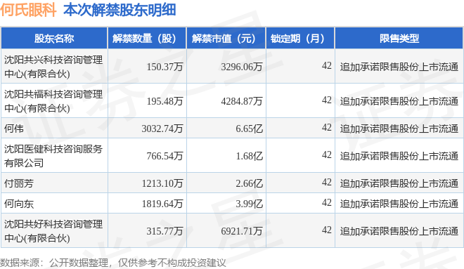 证券之星消息,根据市场公开信息整理,何氏眼科(301103)于9月22日将有7493.63万股限售股份解禁,为公司追加承诺限售股份上市流通,占公司总股本47.42%。(本次数据根据历史公告整理得出,实际情况以上市公司最新公告为准)本次解禁后,公司已无限售股份。具体如下图所示: