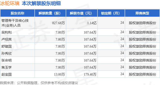 证券之星消息,根据市场公开信息整理,冰轮环境(000811)于9月22日将有887.48万股限售股份解禁,为公司股权激励限售股份,占公司总股本0.89%。(本次数据根据历史公告整理得出,实际情况以上市公司最新公告为准)本次解禁后,公司还有1418.59万股限售股份,占总股本1.43%。具体如下图所示: