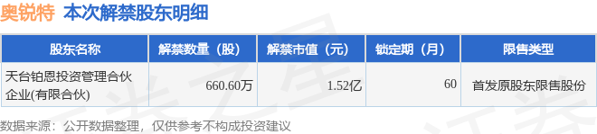 证券之星消息,根据市场公开信息整理,奥锐特(605116)于9月22日将有660.6万股限售股份解禁,为公司首发原股东限售股份,占公司总股本1.63%。(本次数据根据历史公告整理得出,实际情况以上市公司最新公告为准)最近一年内,该股累计解禁207.8万股,占总股本的0.51%。本次解禁后,公司还有207.8万股限售股份,占总股本0.51%。具体如下图所示: