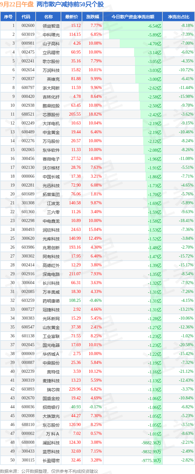 两市散户减持最多的前十只个股为: