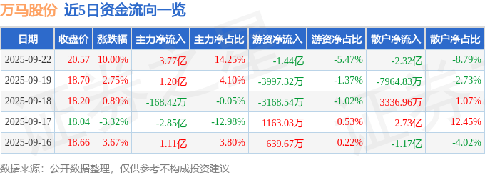 证券之星消息,万马股份9月22日涨停收盘,收盘价20.57元。该股于10点24分涨停,未打开涨停,截止收盘封单资金为1.89亿元,占其流通市值0.91%。