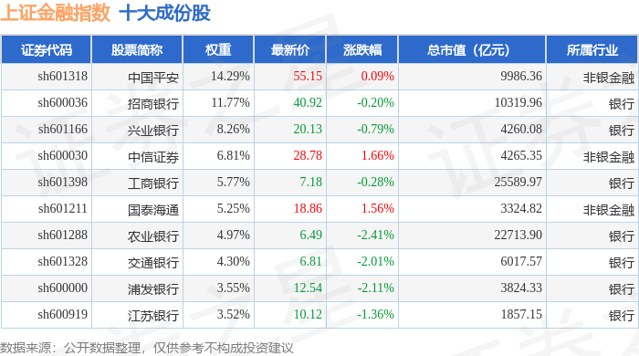 证券之星消息,9月22日,上证金融(000038)指数报收于5482.14点,跌0.33%,成交339.78亿元,换手率0.23%。当日该指数成份股中,上涨的有10家,华泰证券以1.9%的涨幅领涨,下跌的有20家,农业银行以2.41%的跌幅领跌。