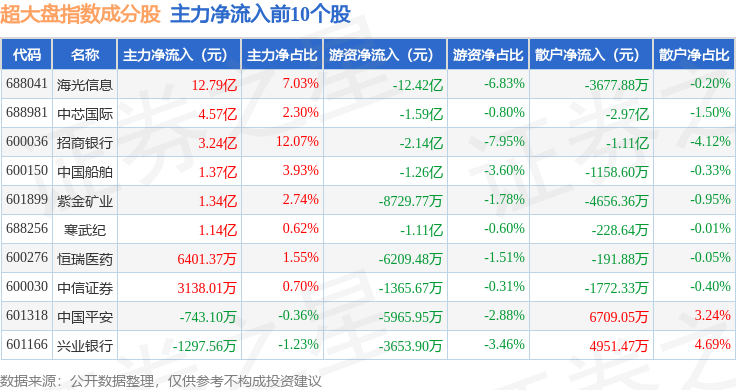 资金流向方面,超大盘(000043)指数成份股当日主力资金净流入合计7.35亿元,游资资金净流出合计14.36亿元,散户资金净流入合计7.01亿元。成份股资金流向详情见下表: