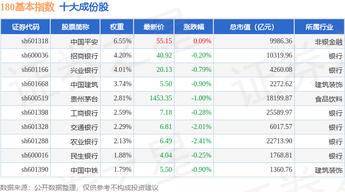 180基本(000053)指数十大成份股详情如下: