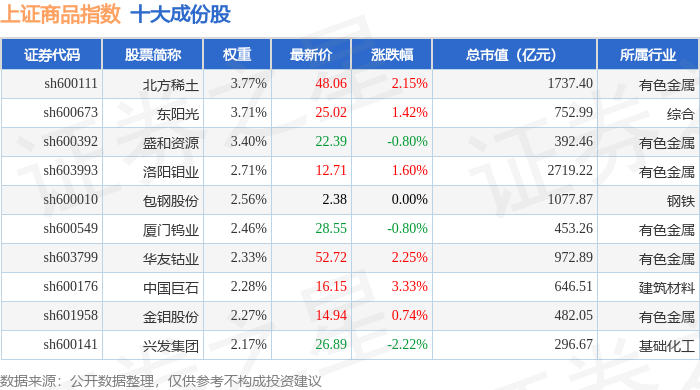 证券之星消息,9月22日,上证商品(000066)指数报收于3100.71点,涨0.11%,成交558.24亿元,换手率0.7%。当日该指数成份股中,上涨的有15家,中金黄金以9.42%的涨幅领涨,下跌的有34家,华鲁恒升以4.03%的跌幅领跌。