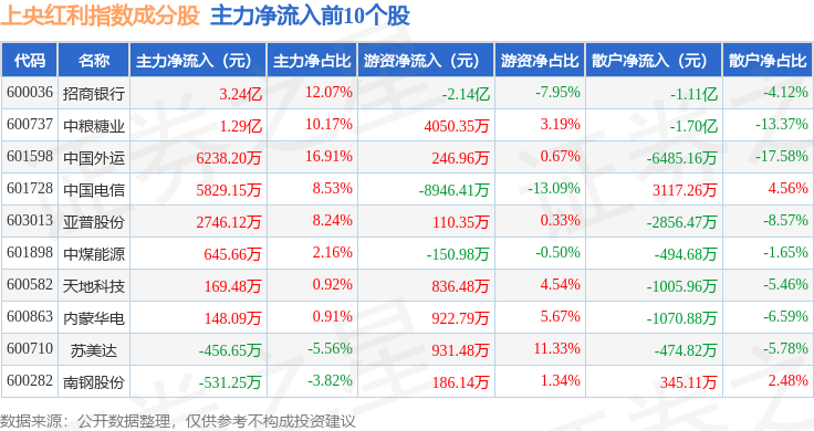 资金流向方面,上央红利(000152)指数成份股当日主力资金净流出合计13.5亿元,游资资金净流入合计2.39亿元,散户资金净流入合计11.11亿元。成份股资金流向详情见下表: