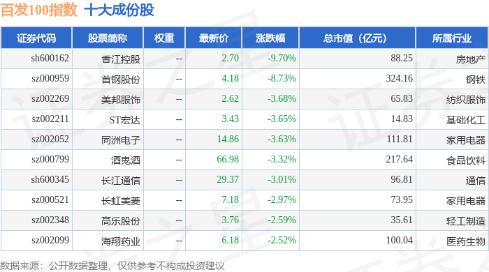 资金流向方面,百发100(000851)指数成份股当日主力资金净流出合计16.36亿元,游资资金净流入合计2.68亿元,散户资金净流入合计13.68亿元。成份股资金流向详情见下表: