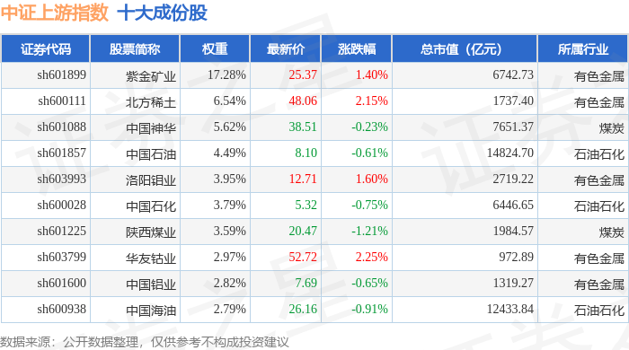 证券之星消息,9月22日,中证上游(000961)指数报收于4075.93点,涨0.59%,成交651.78亿元,换手率0.68%。当日该指数成份股中,上涨的有15家,中金黄金以9.42%的涨幅领涨,下跌的有35家,杰瑞股份以3.79%的跌幅领跌。