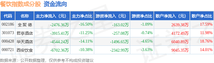 资金流向方面,餐饮指数(399238)成份股当日主力资金净流出合计1.76亿元,游资资金净流出合计4259.75万元,散户资金净流入合计2.19亿元。成份股资金流向详情见下表: