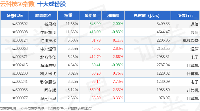 云科技50(399279)指数十大成份股详情如下:
