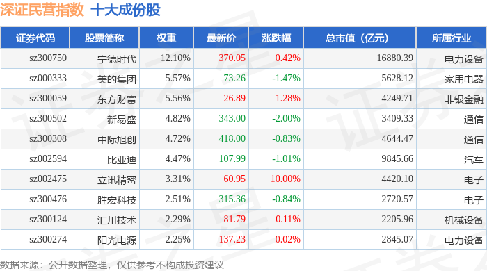 深证民营(399337)指数十大成份股详情如下: