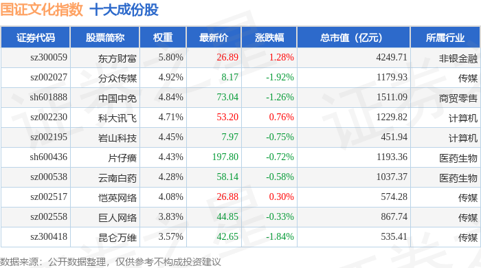 国证文化(399397)指数十大成份股详情如下: