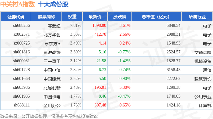 中关村A(399422)指数十大成份股详情如下: