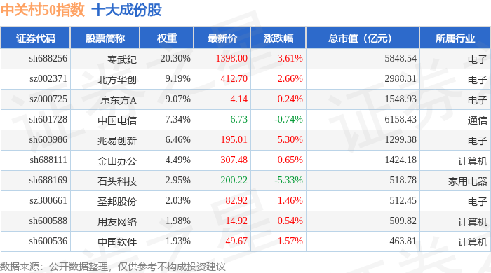 中关村50(399423)指数十大成份股详情如下: