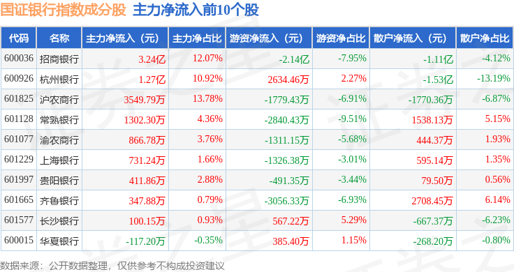 资金流向方面,国证银行(399431)指数成份股当日主力资金净流出合计6.79亿元,游资资金净流出合计2.41亿元,散户资金净流入合计9.21亿元。成份股资金流向详情见下表: