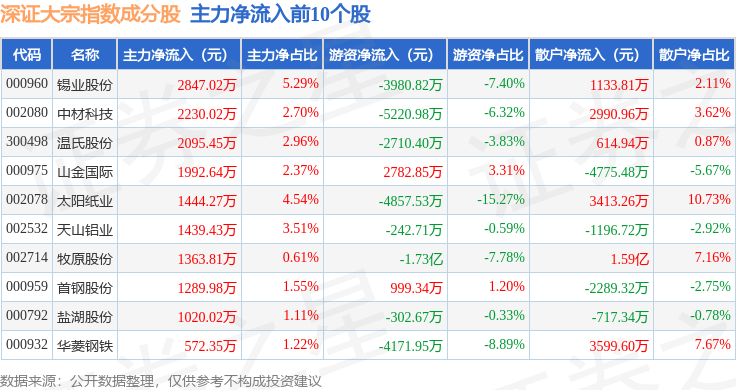 资金流向方面,深证大宗(399639)指数成份股当日主力资金净流出合计22.87亿元,游资资金净流入合计4.21亿元,散户资金净流入合计18.66亿元。成份股资金流向详情见下表: