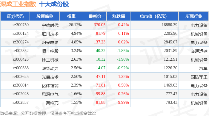 证券之星消息,9月22日,深成工业(399682)指数报收于1796.14点,涨0.33%,成交1192.82亿元,换手率2.21%。当日该指数成份股中,上涨的有48家,大洋电机以10.04%的涨幅领涨,下跌的有62家,锦浪科技以5.06%的跌幅领跌。