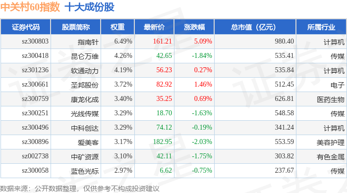 证券之星消息,9月22日,中关村60(399697)指数报收于3740.28点,涨0.91%,成交528.29亿元,换手率4.28%。当日该指数成份股中,上涨的有30家,东华软件以10.0%的涨幅领涨,下跌的有29家,众信旅游以4.93%的跌幅领跌。