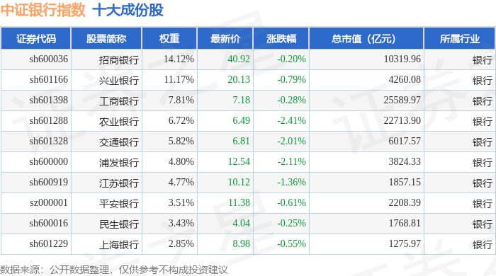 证券之星消息,9月22日,中证银行(399986)指数报收于7262.53点,跌1.01%,成交254.89亿元,换手率0.25%。当日该指数成份股中,上涨的有2家,沪农商行以1.3%的涨幅领涨,下跌的有39家,建设银行以3.27%的跌幅领跌。