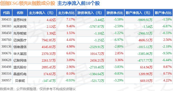 资金流向方面,创指ESG领先R(470031)指数成份股当日主力资金净流出合计50.19亿元,游资资金净流入合计11.5亿元,散户资金净流入合计38.68亿元。成份股资金流向详情见下表: