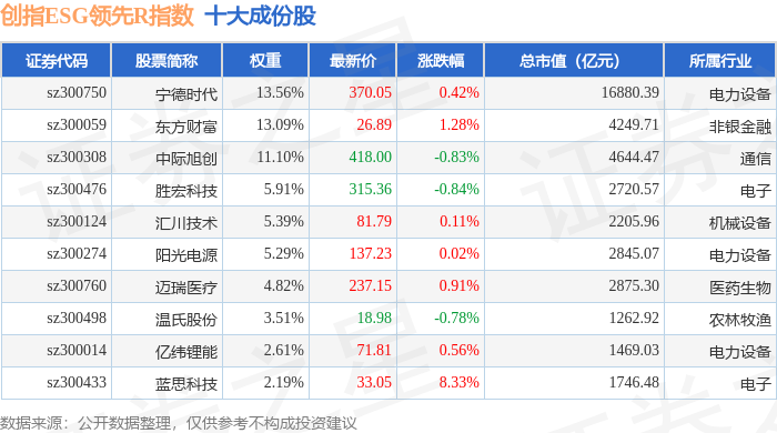 创指ESG领先R(470031)指数十大成份股详情如下: