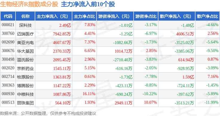 资金流向方面,生物经济R(470038)指数成份股当日主力资金净流出合计5.24亿元,游资资金净流出合计2.02亿元,散户资金净流入合计7.25亿元。成份股资金流向详情见下表: